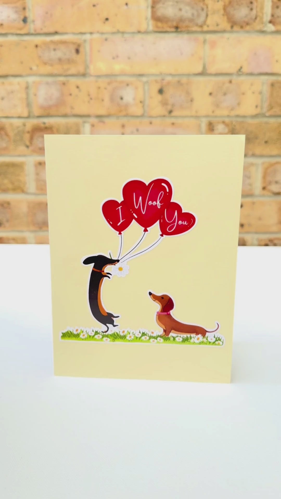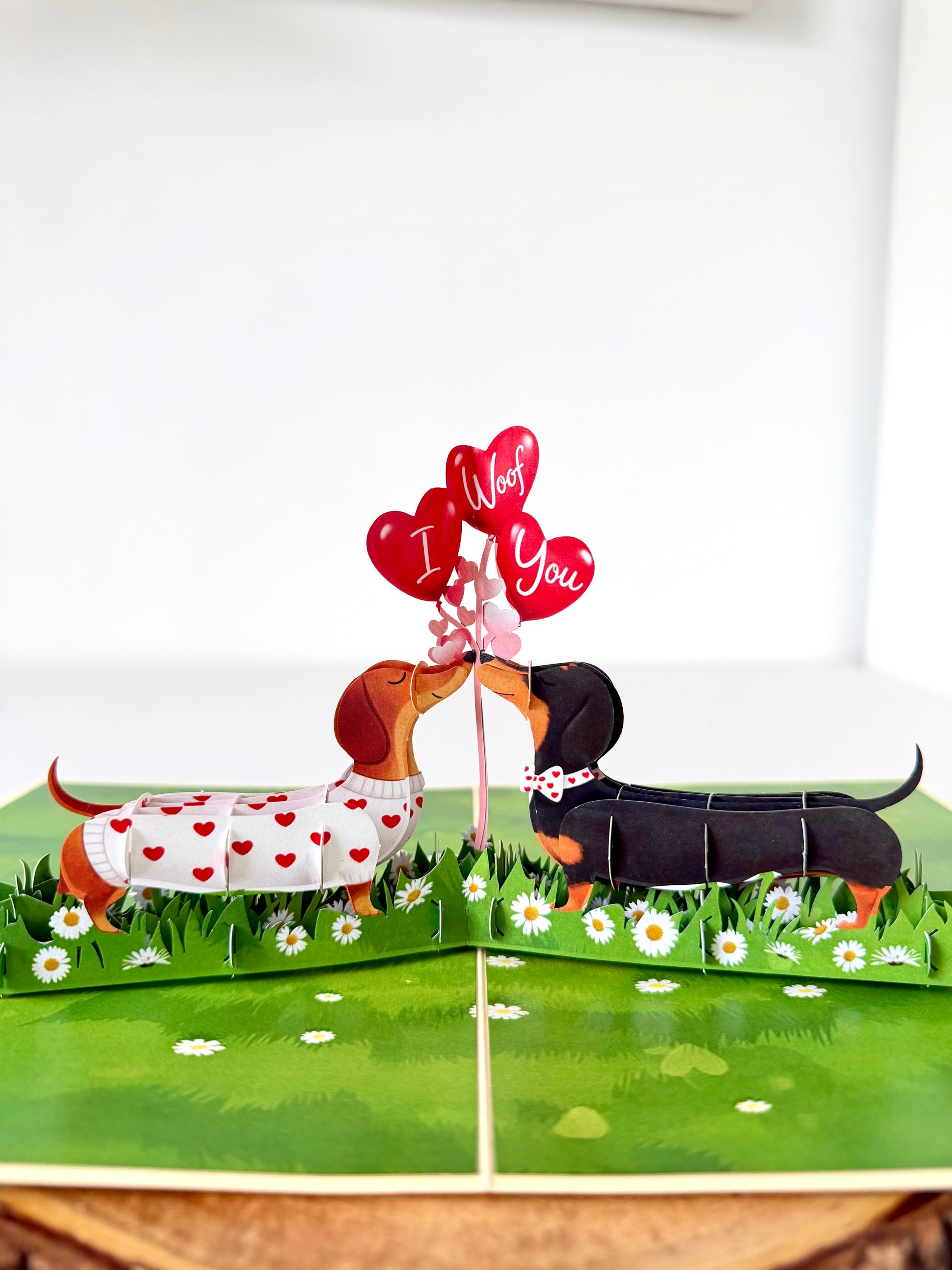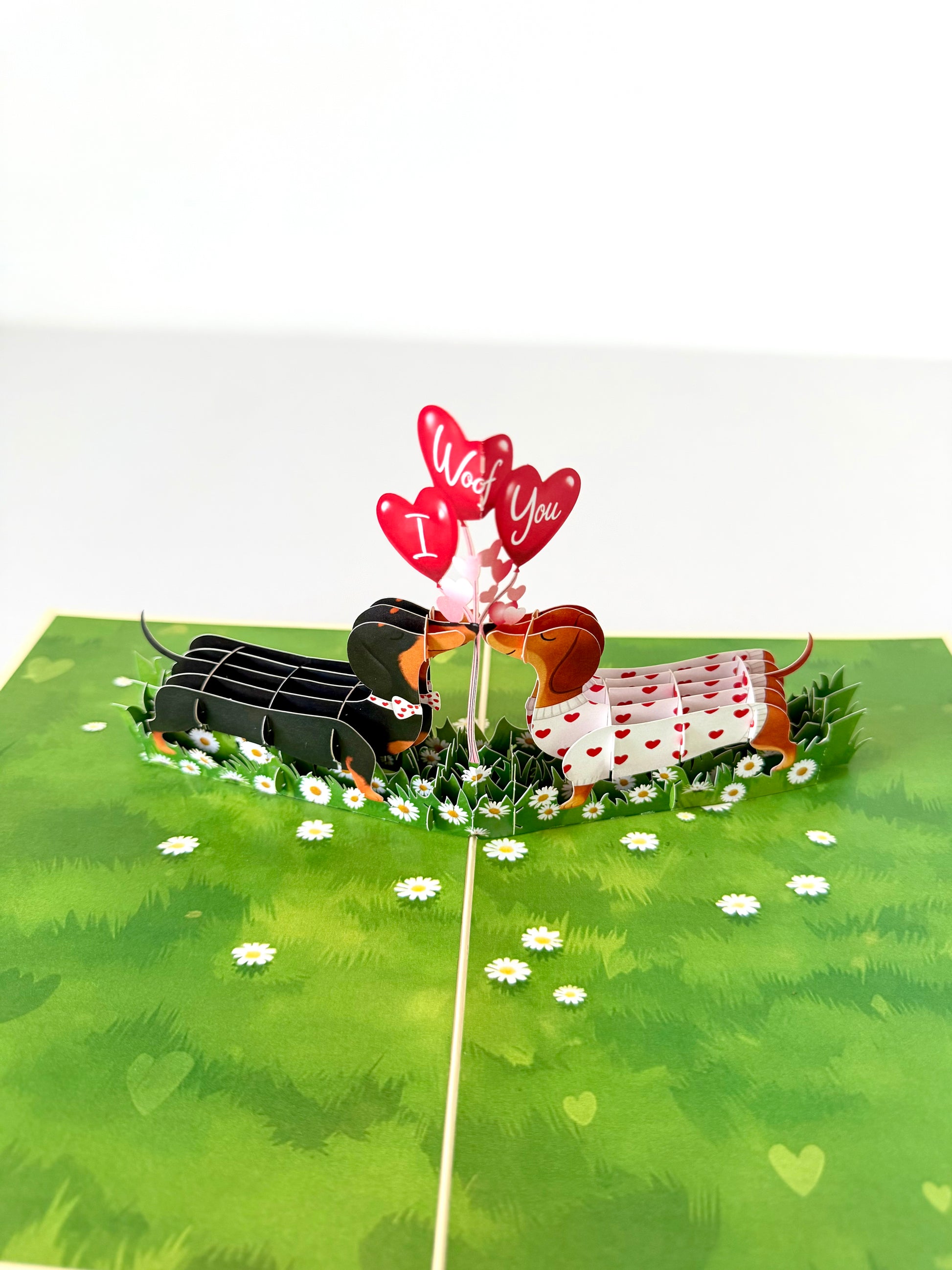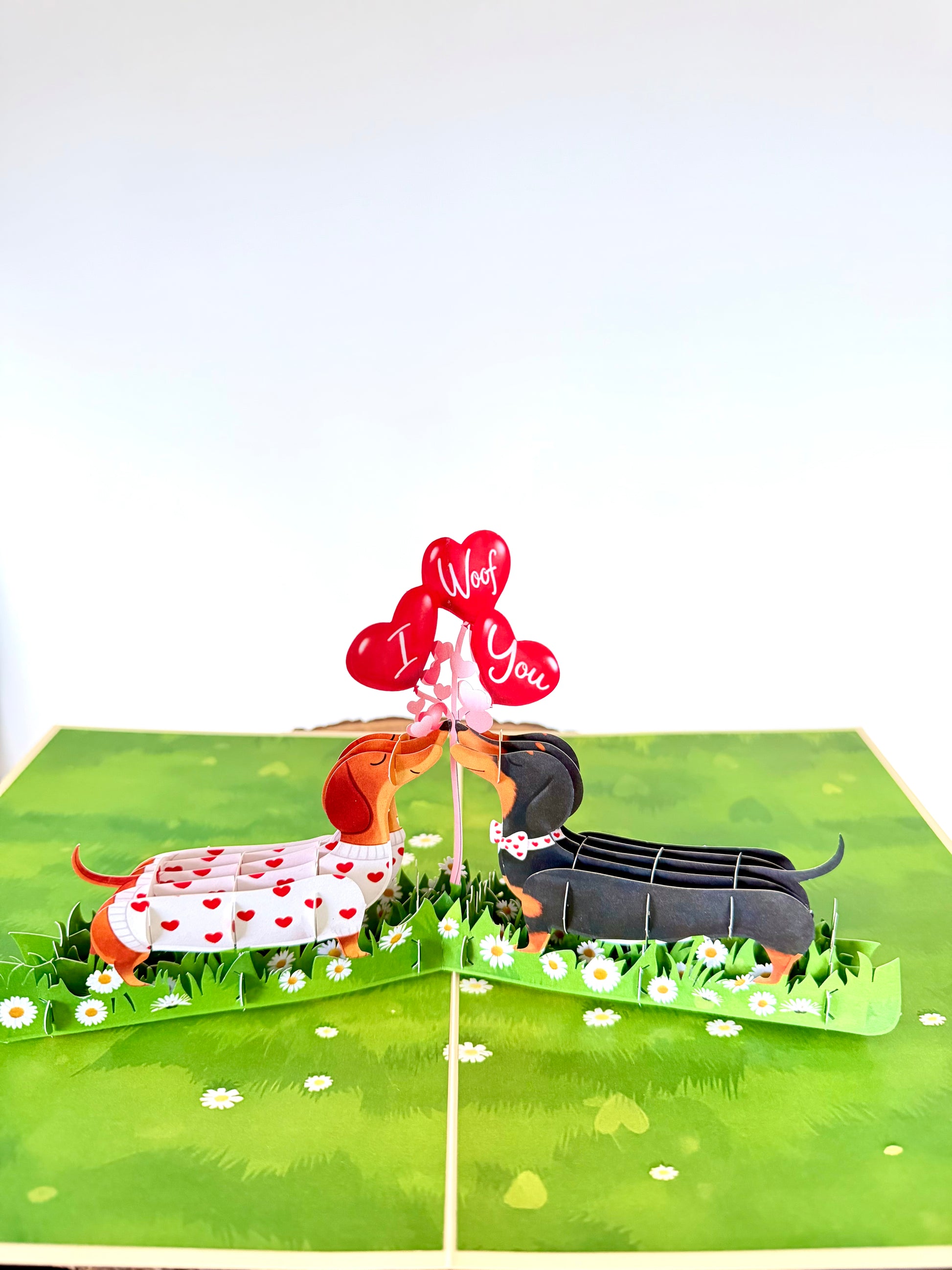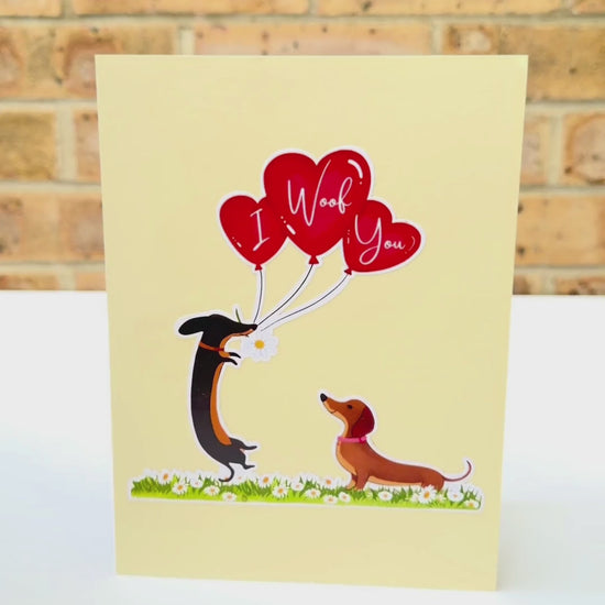 Delight dog lovers with this adorable 3D pop-up card featuring a charming dachshund couple in love. When opened, the card reveals an intricate paper sculpture of two sweet sausage dogs sharing a tender moment with red balloons in the middle that say “I woof you” in a field of green grass and white daisies—perfect for celebrating romance with a playful twist.