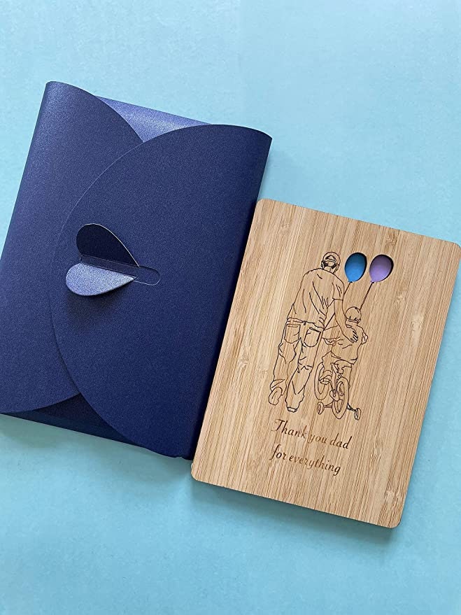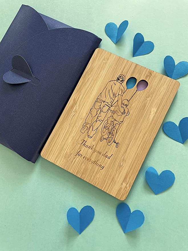 Express your gratitude with this sentimental handmade bamboo card featuring the touching message 'Thank you dad for everything' with a beautiful engraving of dad teaching son how to ride a bicycle. Presented in an exquisite 3D structured blue love heart envelope with balloon cut-outs, this eco-friendly card is a meaningful keepsake.