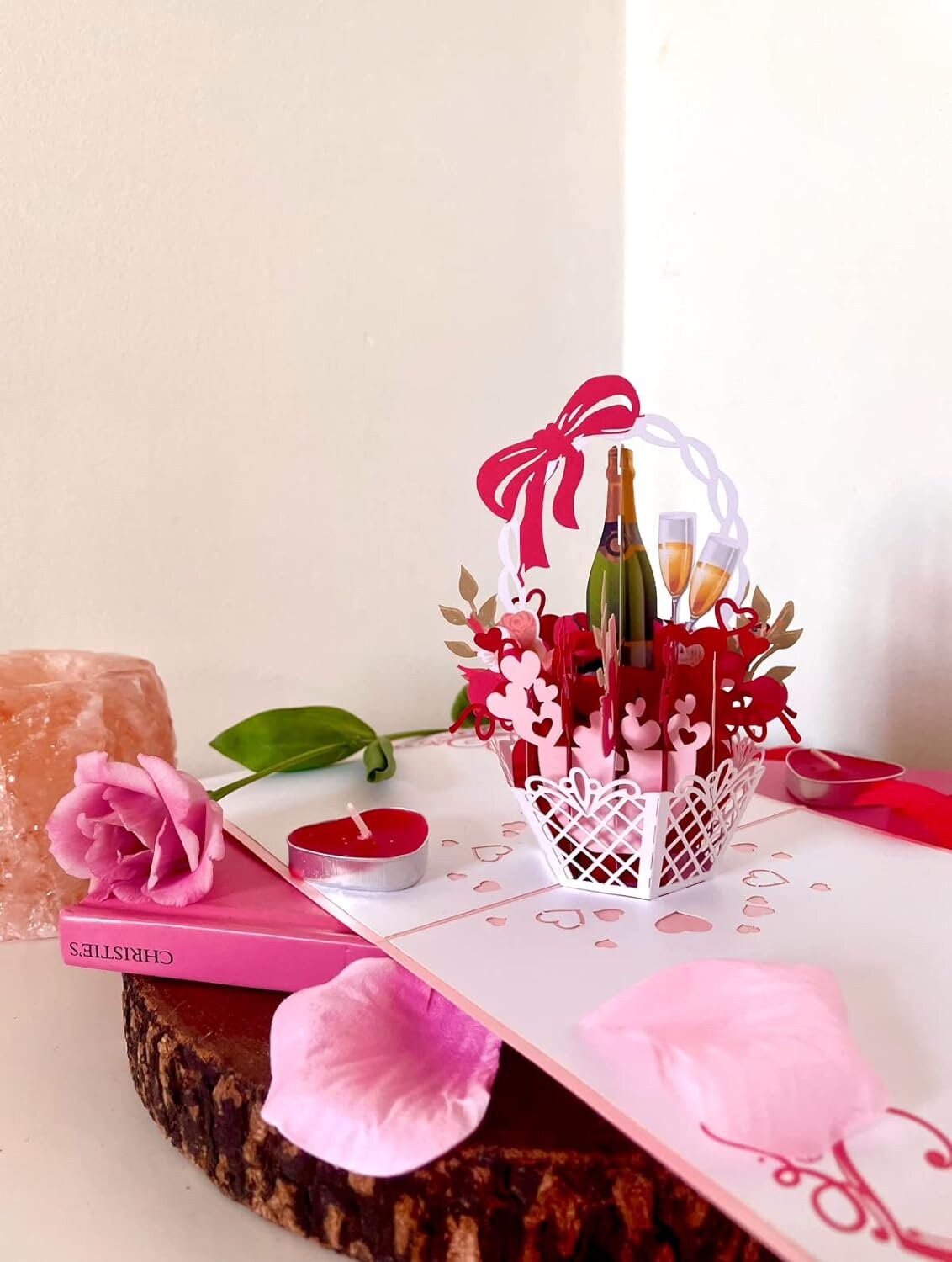 Toast to love with this elegant 3D pop-up card featuring a romantic flower basket with champagne. When opened, the beautiful scene springs to life in vibrant colours, creating a sophisticated moment perfect for celebrating special occasions.