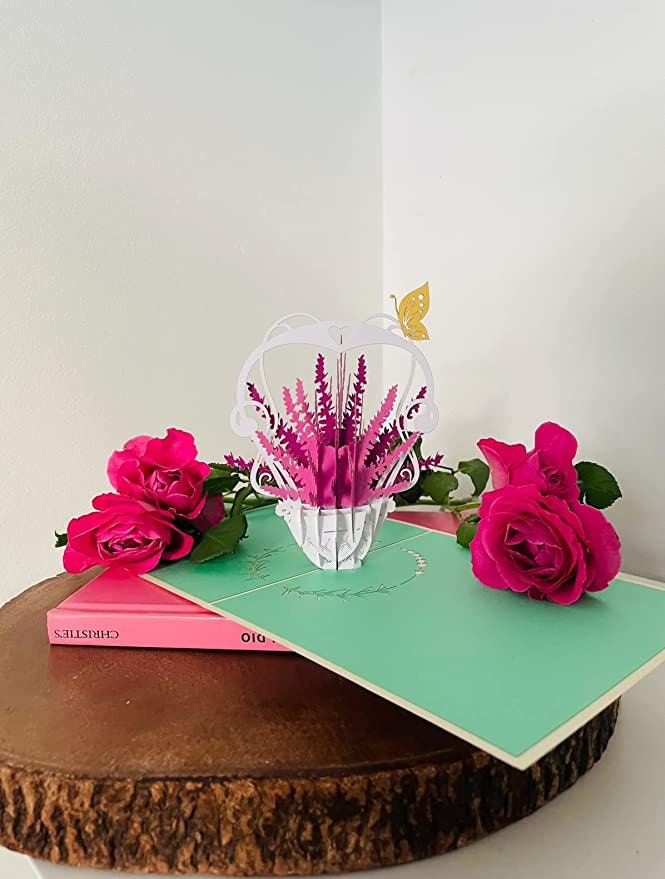 Delight your loved one with this elegant 3D pop-up card featuring a basket full of bright purple lavender flowers with a yellow butterfly resting on the handle. When opened, the beautiful scene springs to life, capturing the calming beauty and fragrance of lavender.