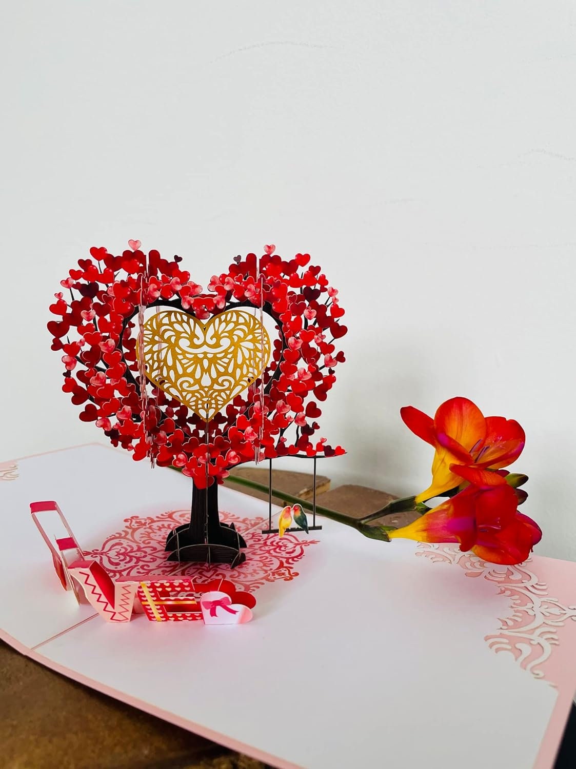Celebrate love with this enchanting 3D pop-up card featuring two love birds kissing while swinging from a heart-shaped red tree. When opened, the romantic scene springs to life in vibrant colours, creating a magical moment perfect for expressing your love.