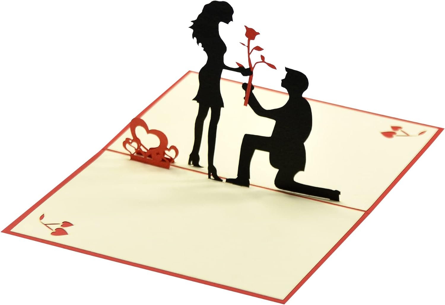 Capture the romance of a classic moment with this beautiful 3D pop-up card featuring a man on bended knee presenting a rose to his beloved. When opened, the couple springs to life in vibrant colours, creating a touching scene that celebrates love and devotion.