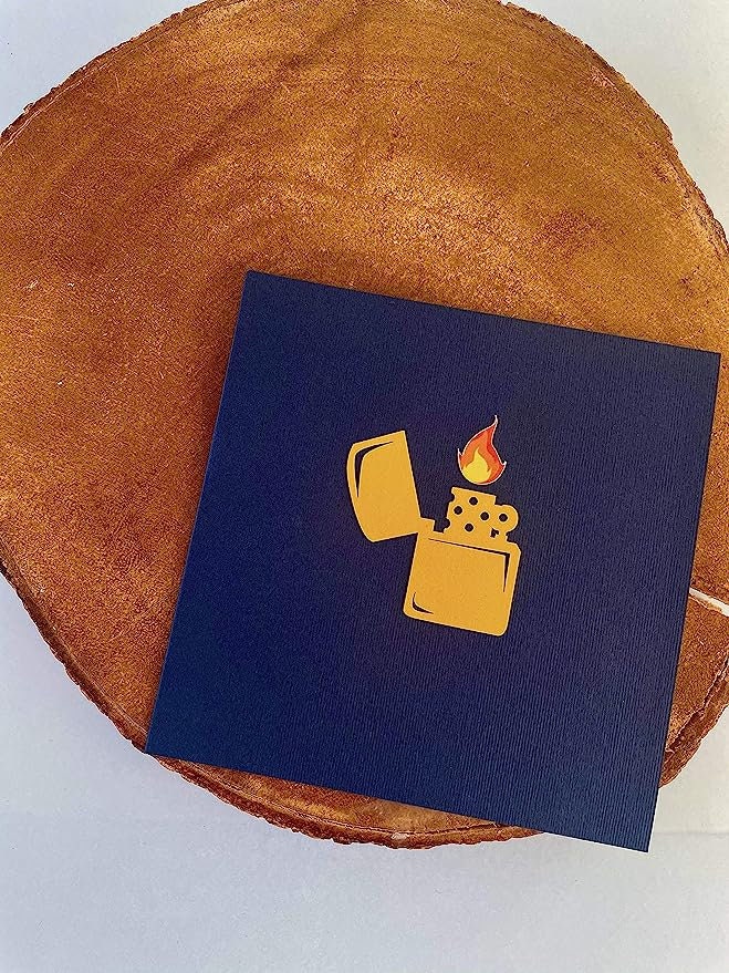 Delight Zippo enthusiasts with this unique 3D pop-up card featuring a zippo lighter with a burning flame that can be manually opened, adorned with a deck of playing cards. When opened, the dark blue zippo springs to life with a yellow flame, creating a cool moment perfect for collectors and fans.